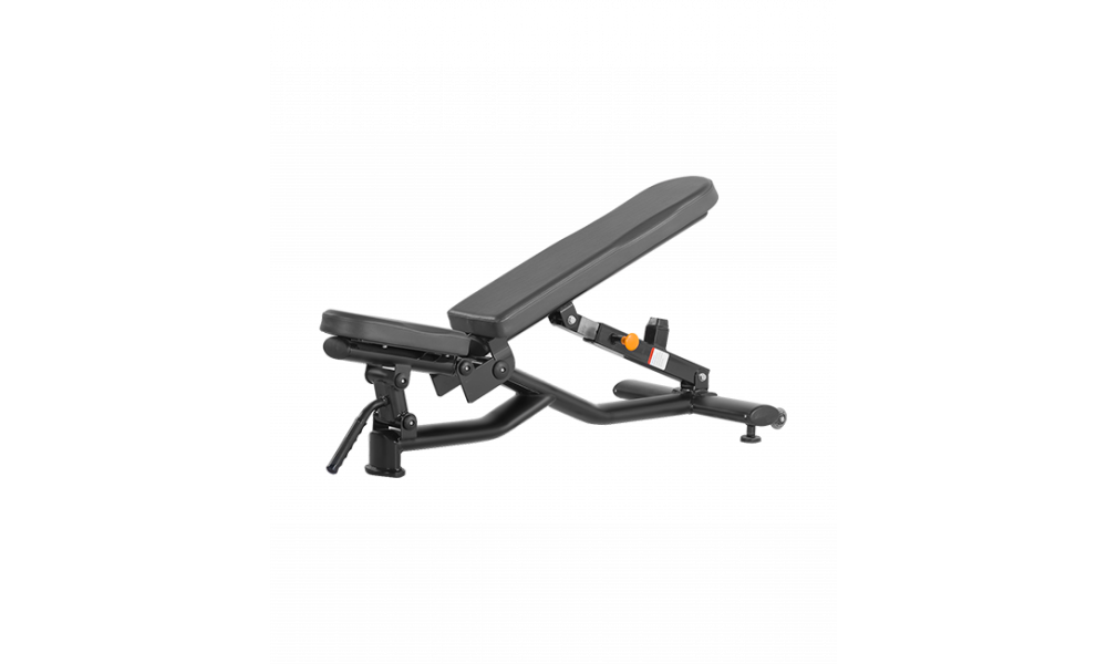 Регулируемая скамья с профилем основной станины 60*120*2.5 мм. для полноценного коммерческого использования. Сидение регулируется в диапазоне от -30 до 0 градусов, спинка сидения - от 0 до 90 градусов. Размер сидения - 90*26 см, размер спинки - 38*26 см, толщина в обоих случаях составляет 6 см.