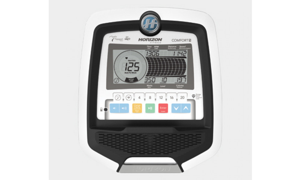 HORIZON™ Comfort 5 VIEWFIT - обновленная версия популярного электромагнитного велоэргометра HORIZON™ Comfort 5. Также как и предшествующая модель, он сконструирован из особо прочной рамы и имеет сбалансированный маховик 8,5 кг., трехкомпонентный педальный узел и запатентованную приводную систему ECB™, которая обеспечивает самый плавный ход и достаточную нагрузку. Изменения произошли в конструкции консоли, на которую добавлены кнопки управления громкостью, и руля, который теперь имеет эргономичные ручки и встроенные сенсорные датчики пульса. Но все же это не главное. Самое значительное изменение - это наличие суперсовременного приложения для мониторинга своих тренировок - VIEWFIT. В чем же его особенность, и как оно работает? VIEWFIT - это приложение, которое соединяет тренажер Horizon Comfort 5 VIEWFIT с Вашим гаджетом по Wi-Fi. Скачав его бесплатно на свой мобильный телефон или планшет, вы сможете: ставить себе цели и стремиться к их достижению. Варианты предлагаемых целей: количество тренировок в неделю, количество потраченных калорий, время на тренировку и расстояние, которое вы планируете преодолеть в течение недельного цикла занятий; отслеживать и анализировать результаты, которые станут доступны в приложении сразу после того, как вы закончите свою тренировку; если вы занимались не на тренажере, оборудованном VIEWFIT, а, например, играли в футбол на улице, вы сможете внести данные о своей спортивной активности вручную, и эти данные будут учтены; присоединяться и участвовать в ежемесячных мировых соревнованиях с реальными людьми в разных точках планеты. Станьте первым! Выиграйте состязание!; делиться своими результатами в социальных сетях с друзьями и знакомыми, получая дополнительный стимул, поддержку и мотивацию. С VIEWFIT Вы всегда будете в компании единомышленников. Нельзя не сказать и о возможности подключения опции "Виртуальный ландшафт" посредством роутера Passport™. Помимо этого, в консоль встроен телеметрический Polar приемник. В этом случае, при сравнении с обычными датчиками пульса, использование пульсозависимых программ становится действительно эффективным - точность измерения пульса близка к медицинской, не зависит от индивидуальных особенностей организма (т.н. проблема "сухих рук" или недостаточной электропроводности) и, наконец, это значительно удобнее. В число программ входят несколько предустановленных разнонаправленных тренировочных профилей, а также ручной режим, 2 пульсозависимые, 2 пользовательские и 1 Ватт-фиксированная программы. Большая многофункциональная черно-белая LCD консоль диагональю 5.5 дюйма (15.9 см.) выводит на экран все основные параметры, включая профиль выполняемой тренировки. Интересной особенностью компьютера является индикатор активных зон, показывающий насколько пользователь справляется с целями тренировки. HORIZON™ Comfort 5 VIEWFIT - продукт американского концерна Johnson Health Tech. Это единственный в мире производитель домашнего фитнес-оборудования полного цикла - начиная от идеи продукта, затем технической, биомеханической и дизайнерской разработки и заканчивая производством на собственных фабриках из собственных комплектующих. Бренд HORIZON™ является одним из лидеров продаж на американском и европейских рынках и отмечен массой различных наград за достижения в области инноваций, биомеханики и дизайна.